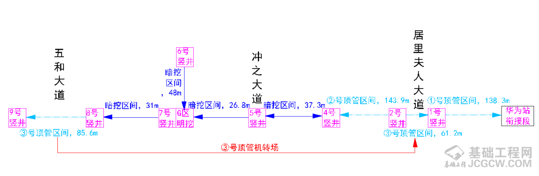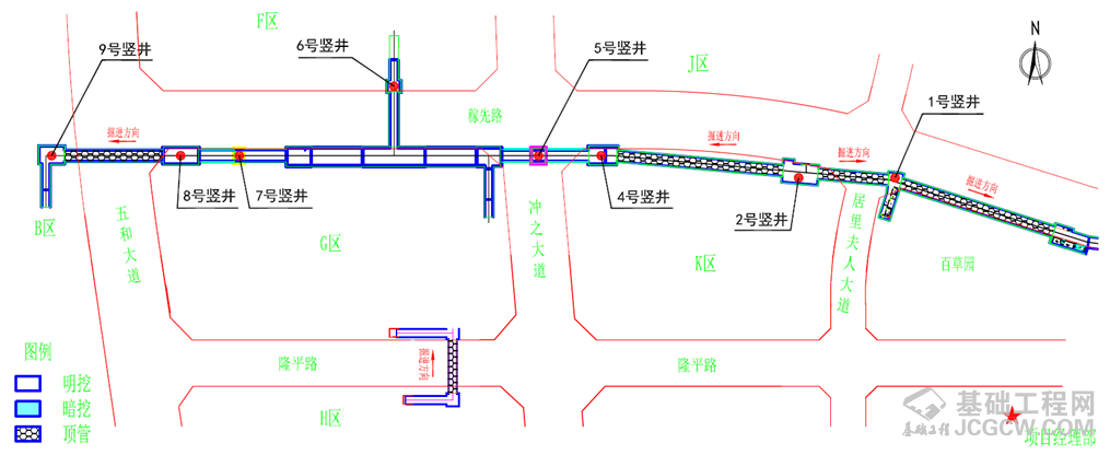 优化顶管顶进方案。将暗挖段改为两导洞台阶法开挖、管幕超前支护,提高施工效率的同时,降低成本及对周边环境的扰动;优化顶管机顶进方案,将5台顶管机优化为4台,降低了因顶管机制造周期长而对项目施工造成的影响;深度优化管节断面、切割部位,在竖井中部设置反力墙,调整顶管顶进方向,实现了一个竖井两台顶管机同时作业,有效地保证了工期;在关键节点明挖共建段,主动与相关单位沟通,将连接段交付房建单位施工,并利用房建单位基坑道路进行明挖段基坑开挖及外运土方,实现互利共赢。