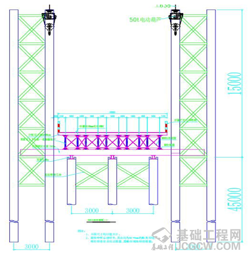 钢栈桥提升设计栈桥宽度8m,长度30m,钢栈桥整体提升总重为120吨,有效提升高度12m,采用4台50吨电动葫芦同时提升,立柱采用四组钢管结构,每组3根630*10钢管桩,横梁采用双拼工630。