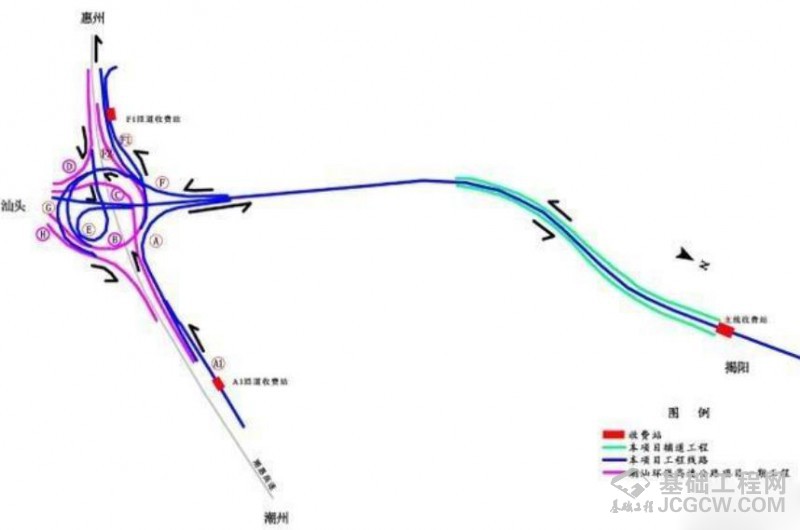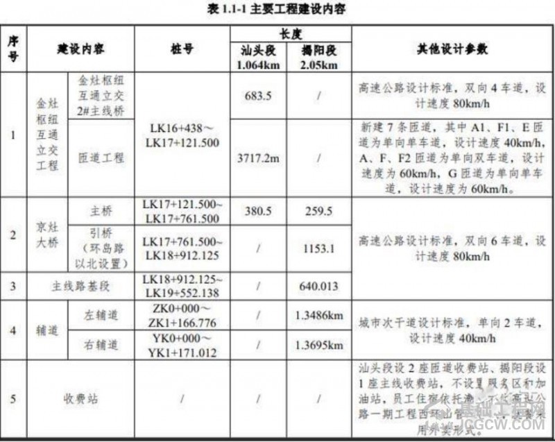 为更好连通汕头市潮阳区和揭阳市空港经济区,同时充分发挥高速公路的互联互通作用,本次建设的潮汕联络线延长线(京灶大桥),自金灶枢纽互通进行延长,采用主线上跨方式与潮惠高速相交(潮惠高速目前已通车),自南向北跨越榕江南河(设置 1 座京灶大桥),之后分别在桩号 LK17+950、LK18+320 跨越揭阳市环岛路、规划路后,在京南村新乡东侧通过,终点设置主线收费站后接入揭阳市发展大道(已建成),主线全长 3.114km,同时在揭阳段主线(环岛路以北)两侧新建左右辅道,与现状发展大道相接。
