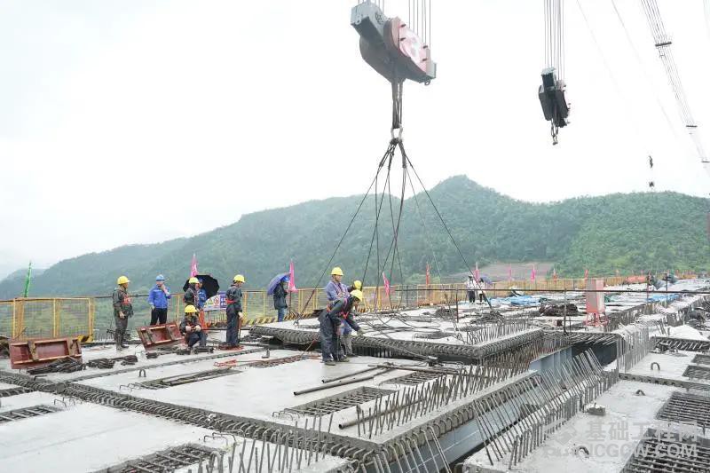 南浦溪特大桥则是项目控制性节点工程,全桥长444.96米,主跨为258m上承式钢管砼拱桥,为浙江省最大的上承式钢管砼拱桥,备受浙江省社会各界关注。南浦溪特大桥设计桥面板共352块,吊装过程具有现场环境复杂、安装精度控制高、高空施工安全风险大、预留空间狭小等特点。