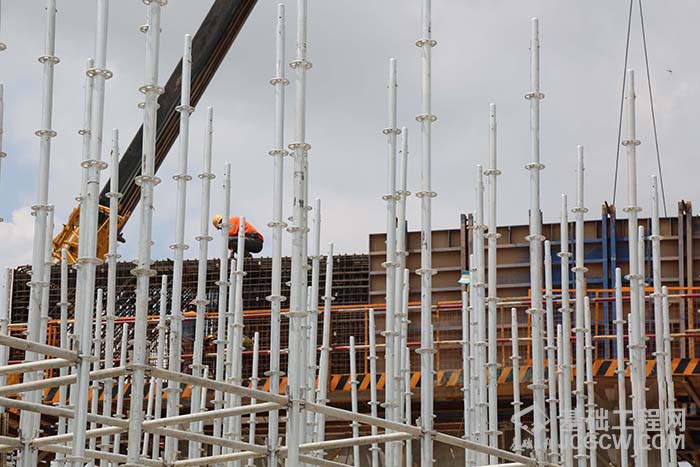 从石马新河特大桥桥头西互通现浇梁的施工现场采访了解到,施工人员正在对这个支架进行搭设,完了以后就对这个支架进行一个预压,接着是一个板钢筋的安装,最后是对这个支架进行一个混凝土的浇注,整段长1.6公里的现浇梁施工预计今年的8月底能够完工。