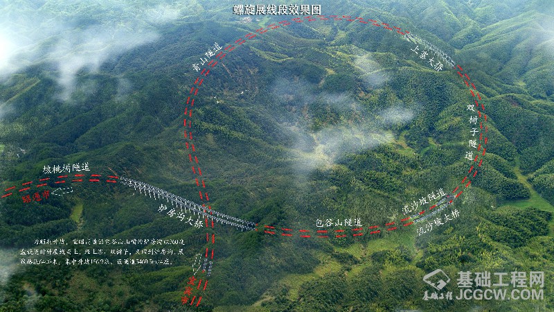 宜昭高速螺旋展线布局依次为青山隧道,上寨大桥,再经双树子隧道、流沙坡中桥、包谷山隧道、炉房沟大桥,形成360°螺旋展线布线,最大高差达156.9米。