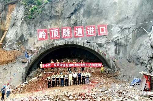 6月15日上午9点39分,浦清高速五标段及全线控制性工程、全线最长隧道——岭顶隧道进口右洞顺利进洞,岭顶隧道正式开始了双向掘进。岭顶隧道位于玉林市博白县三滩镇、黄陵镇,为双洞分离式隧道,左幅长度2737米,右幅长度2697米。施工中采用双向掘进的方法施工,建设工期29个月。