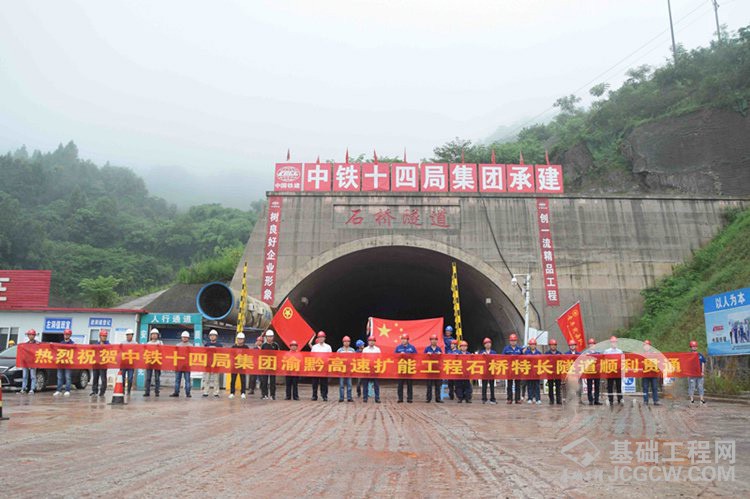 由中铁十四局承建的石桥隧道,是渝黔高速公路扩能项目3座特长隧道之一,是全线及第一合同段重难点控制性工程之一,双向六车道,设计时速100公里,左洞长度3137米,右洞长度3044米,隧道洞身围岩以全风化、中风化的砂岩、泥岩为主,强度等级偏低,岩体和进出口稳定性差,易产生坍塌风险,导致开挖安全风险高,施工难度极大。