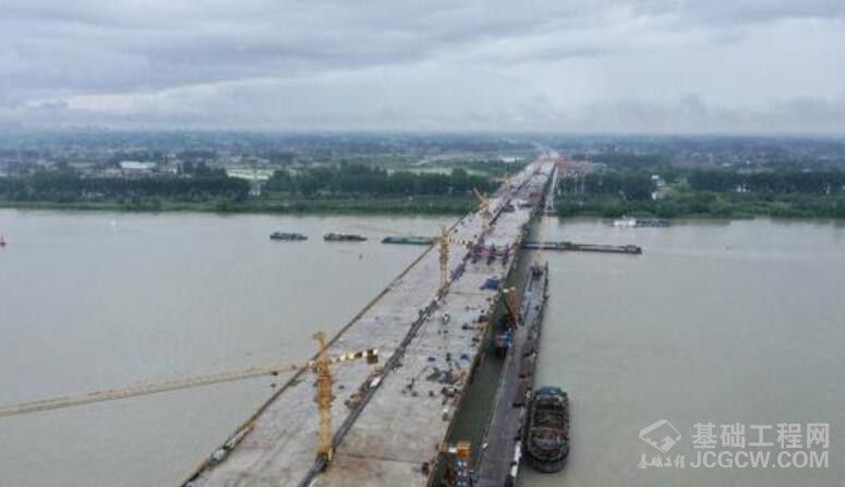 江苏省交通工程建设局五峰山过江通道公路接线工程建设指挥部副总指挥张向群介绍,芒稻河特大桥是五峰山过江通道南北公路接线项目的重要控制性工程,主桥采用(77+3*130+82)米预应力混凝土连续刚构组合体系,施工技术难度大、安全控制风险高,工程建设极具挑战性。承台采用深水超长钢板桩围堰施工,钢板桩长度36米,水下开挖深度达25米,围堰内外水头差19米,是目前全国最深的钢板桩围堰基础。此次大桥的顺利合龙,标志着重大技术难题已顺利攻克,为全线贯通奠定了坚实基础。
