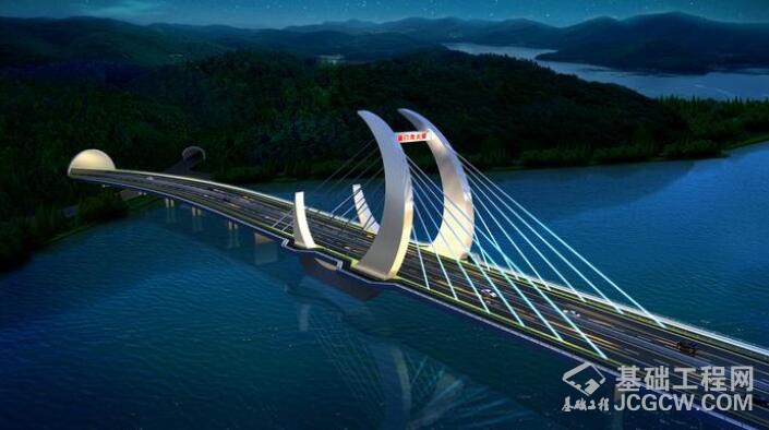 “月环”型的桥塔,体现“春江潮水连海平,海上明月共潮生”的意境,寓意玉环的经济和社会发展如潮水般生生不息。