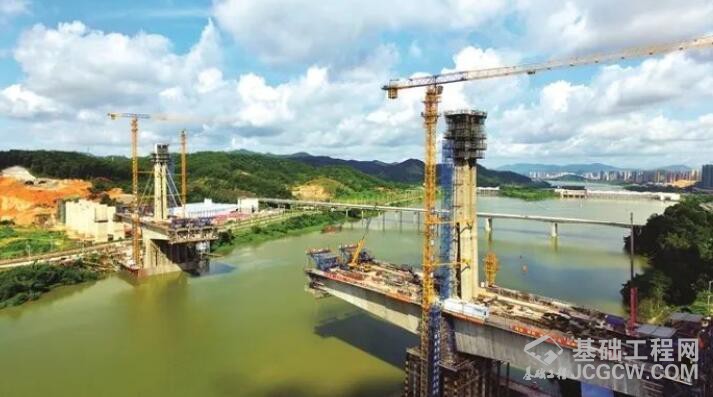 小编在赣深高铁剑潭东江特大桥建设现场看到,两座高塔矗立在东江两岸,高塔两侧正在进行桥面连续梁施工。