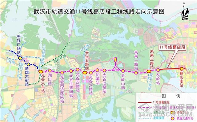 葛店段西起11号线光谷左岭站,东至城际铁路葛店南站,是湖北省首条跨市地铁。该工程共一站一区间,线路全长约3.7公里,均为地下线,其中盾构区间全长3.1米。