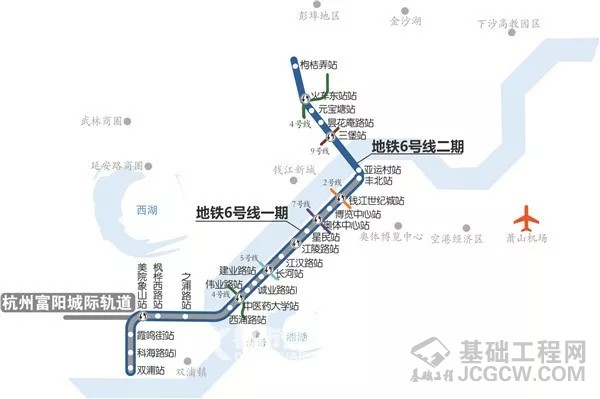 地铁6号线一期西起之江新城的双浦站,止于萧山亚运村区块的丰北站,全长约为27公里,共设19座车站,其中换乘站6座,分别与地铁1、2、4、5、7号线和杭富线换乘,线路采用AH型车。目前全线车站主体结构均已完成,正积极推进出入口等附属结构、铺轨、机电安装和装修有关工作,计划2020年底建成。