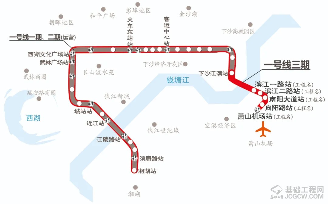 地铁1号线三期工程(下沙江滨站(不含)-萧山机场站)设站5座,全长11.2公里,线路采用6节编组B型车。目前,全线5座车站均已完成主体结构施工,实现“洞通”后,目前正在进行出入口等附属机构、铺轨、机电安装和装修有关工作,计划2020年底建成。