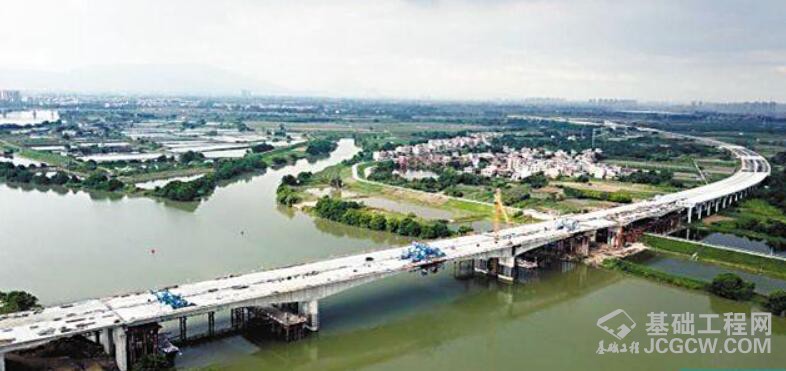 增江特大桥位于增城区石滩镇,全长1615.6米,是花莞高速控制性工程。该桥跨越增江水道,跨河段连续梁主跨达125米,连续梁施工区域河床沙层厚、水位变化大,地质条件复杂,施工难度大。