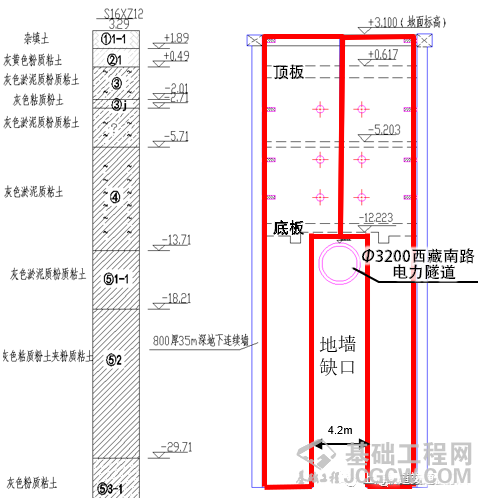 在8号线站体东侧,14号线主体结构下方有一条直径3.2米的电力隧道南北向贯穿主体结构。14号线主体结构在此处开挖特划出B区基坑。B区基坑欲构筑的车站底板距电力隧道仅0.5米,同时,该区基坑的北侧围护和南侧围护的分别产生4.2米的地墙缺口,形成“翘脚”地墙,造成基坑施工难度很大。