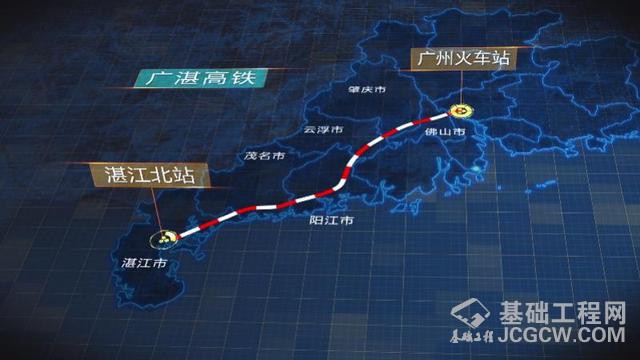 广湛高铁正线全长约401千米,线路起于广州火车站,途经佛山、肇庆、云浮、阳江、茂名、湛江等市,终至湛江北站,西连湛江枢纽,设计行车时速350千米,项目建设工期5年,投资总金额估算998亿元。