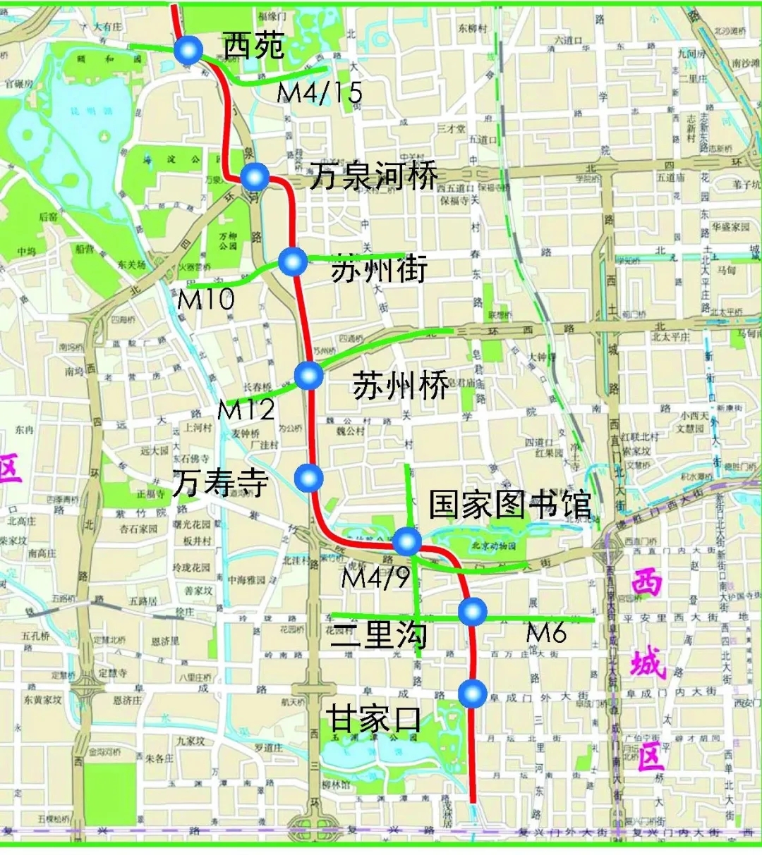 16号线是一条贯通南北的地铁骨干线,途经海淀、西城、丰台三个行政区。16号线中段北起西苑站,南至甘家口站,线路全长10公里,共设7座车站,包含国家图书馆站、苏州街站、苏州桥站、二里沟站4座换乘站。全线采用A型车8辆编组,列车最高运行速度80公里/小时。