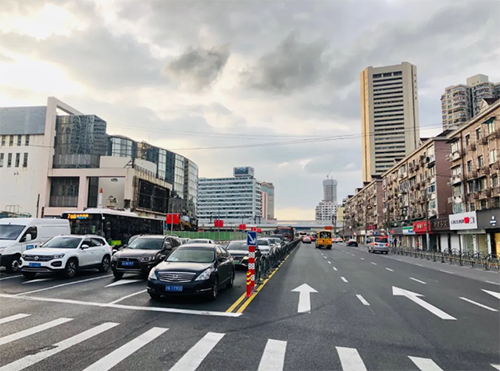 建设方通过前期与交警部门和居民的交流沟通,不断优化翻交道路方案,在武宁路凯旋北路增加一根直行通道,在武宁路东新路设置公交港湾式停靠站点,充分挖掘路幅潜力,翻交方案得到了各方的认可。同时在翻交实施过程中,利用活动护栏进行隔离,注意保证车辆及行人的安全。