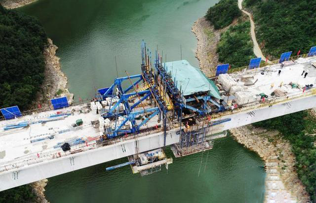 神农溪双线大桥位于湖北省巴东县沿渡河镇境内,大桥全长457.1米,主跨220米,横跨神农溪,两岸山崖陡峭,施工空间狭窄,地形地质条件复杂,是郑万高铁全线跨度最大的连续钢构桥梁,也是郑万高铁湖北段重难点控制工程。