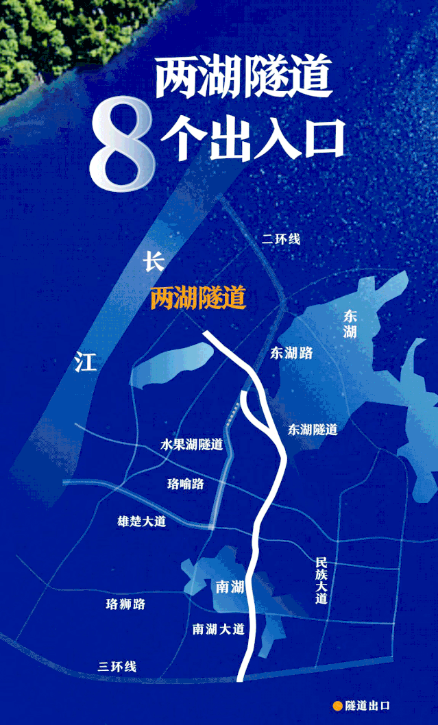据此前官方消息,两湖隧道三环线出入口位于三环线,是一座苜蓿叶式地下互通立交,设置了4个出入口与三环线四个方向均可对接。经两湖隧道的车流可经三环出城,且预留了隧道向南延伸的条件,未来可延伸至汤逊湖江夏片区。
