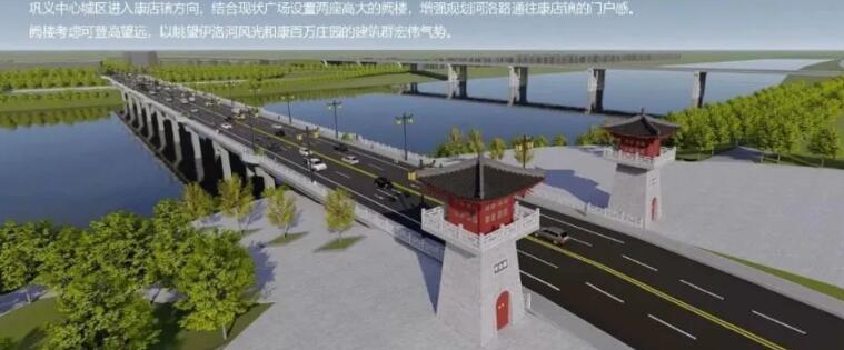 伊洛河康店桥拆除重建工程于11月4日启动,该工程主要拆除重建9座排涝涵闸,并新建1座排涝涵闸。新建康店桥桥面布置采用双向四车道,桥面宽度取24m,两侧人行道各宽4m,中间机动车道宽16m;桥梁总长度为430m,每隔70m设置观景平台,为圆弧形,共计五对,平台外挑1.5m,宽9m;桥梁设计方案消除桥梁原有弯折,直连两岸。