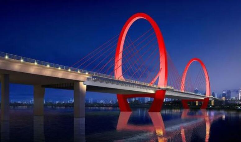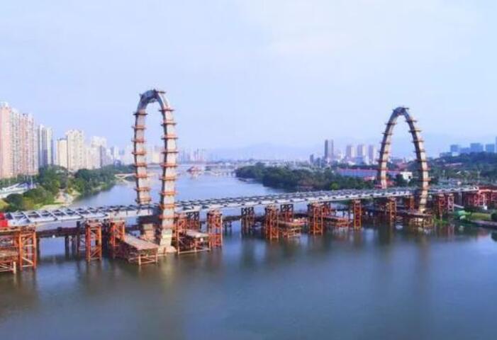 远观芝山大桥,桥面上的顶梁设计极具现代感,该项目主桥采用 “时空之门” 双塔双索面斜拉桥,两个巨大的椭圆形拱门高达69.5米,两个塔柱空间呈现反对称曲线,桥塔横桥向采用水滴形钢索塔,上塔柱采用空间曲线线型,是漳州一座有特色、高难度的大桥。