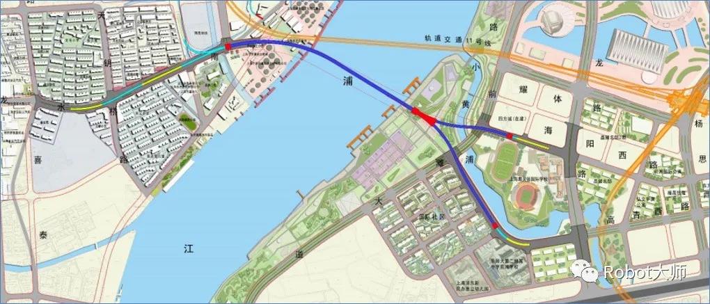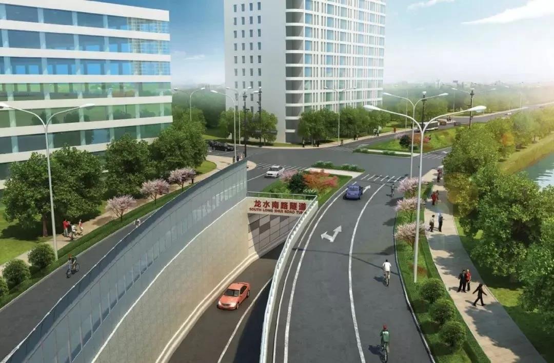 工程西起徐汇区的龙水南路喜泰北路交叉口,工程分南、北两线,北线至浦东新区海阳西路耀龙路交叉口,全长1781m;南线至浦东新区高青西路耀龙路交叉口,全长2331m。浦西出入口分级设置。主出入口接龙水南路,规划六路设辅助出口。项目建成后龙水南路越江隧道将是中心城南部地区重要的越江通道,对增强黄浦江南延伸徐汇滨江核心区域与浦东前滩的两岸联系,分流上中路隧道承担的近江越江交通具有重要作用。