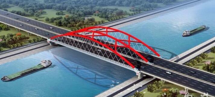 按照设计,新桥主桥采用钢箱网状吊杆拱桥,跨径为150m,设计理念新颖,建成后具有经济美观,跨跃能力大,建筑高度小等优点,上部采用钢板组合梁,而引桥采用“两侧直接拼接加宽”方式而成,将由双向6车道扩容为双向8车道,沥青混凝土桥面,设计速度120公里/小时。