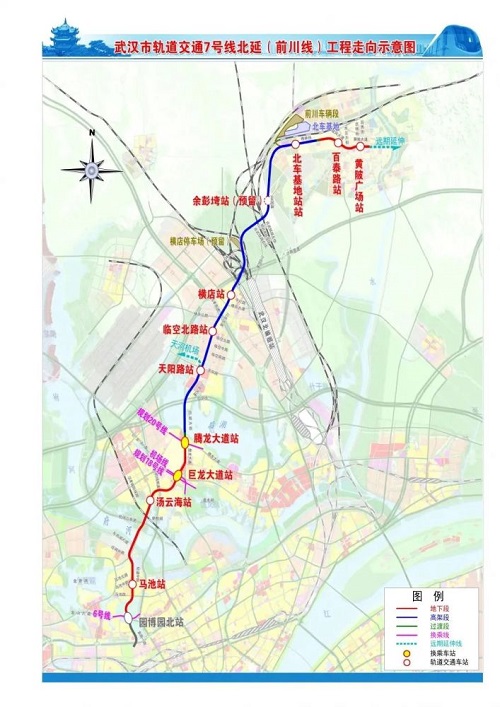前川线是武汉市第四期建设规划的重要线路,由7号线一期园博园北站至黄陂前川,全长36公里,设站11座(含预留站1座),其中高架站5座,地下站6座,途经东西湖区、黄陂区。起点预留向东延伸条件,天阳路站预留天河机场枢纽方向接轨条件。