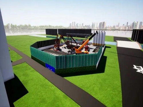 3#风井施工场地狭小,围场仅75mx60m,采用的钢筋笼胎模设置成两节形式。横跨基坑上方的220kV高压线距离地面仅20m,产权单位要求垂直安全距离为6m,施工最高净空不能超过14m,为解决长60m的地墙施工的难题提出两点针对性措施:在成铣槽设备上选用了改制后低净空7.5m成槽机和9m铣槽机,在吊装设备选用上限制275t主吊+100t副吊高度,并对设备全部进行防雷接地处理,从源头上杜绝了设备超高超限。钢筋笼分9节吊装,,保证低净空吊装的安全。同时场地紧邻居民区,为了防止施工噪音对居民产生影响,施工围挡采用8m高的声屏障进行封闭,减少夜间作业安排,将施工影响尽可能降到最小。