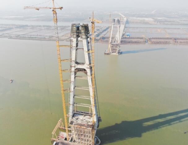 近日,从中电建路桥集团中开高速项目部了解到,中开高速江门段银洲湖特大桥东岸索塔已顺利封顶,进入上部结构快速施工阶段。据悉,银洲湖特大桥跨越银洲湖黄金水道,连接新会区三江、双水两镇,并通过三江互通和双水互通对接江门大道南东线、西线,是中开高速江门段难度最大的重点控制性工程。