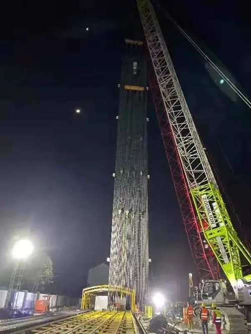 由于该工程地下连续墙成槽深度较深,且地墙槽段沿深度方向地质条件较复杂,为确保地下连续墙施工质量,上海建工机施集团的项目部细化技术方案编制评审,落实钢筋笼制作吊装交底,对履带吊、吊点焊接质量、吊点安装、料索具等涉及重大风险源的节点部位进行验收,确保了首幅钢筋笼顺利起吊。此次钢筋笼的顺利起吊不仅保证了该幅地下连续墙的正常施工,也为今后的起吊打下了坚实的基础。