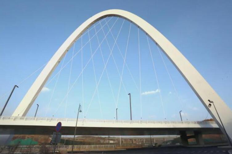这座景观桥从去年7月开始建设,并于去年年底建成,大桥全长646米,宽约24米,桥面为双向六车道,主梁采用钢箱梁结构,属于特大型桥梁,也是太原市目前除汾河桥梁外高度最高的拱桥,单拱斜跨的造型也是太原市独一无二的。这座桥梁是全线的关键节点,由于周边地形复杂且整座拱桥的23块钢拱截断再拼接安装时,误差要求在5毫米以内,施工工艺要求之高,在太原市政工程建设中非常少见。