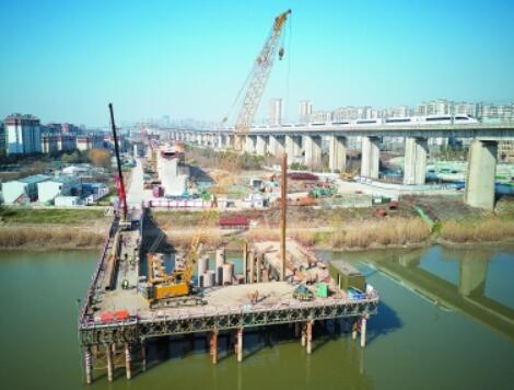 春节假期结束后的第一个工作日,在江宁区上坊桥南100米的秦淮河上,十多名工人正通过履带吊及汽车吊进行锁口钢管桩围堰钢围檩吊装及钢管桩焊接、吊装作业。这是南沿江城际铁路站前工程1标的重难点施工项目之一,他们要在这里打下跨秦淮河特大铁路桥关键的第70号墩柱。