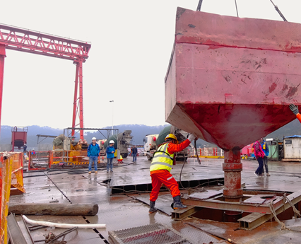 6#主塔共设计24根直径2.8米的钻孔灌注桩,库区最大水深达45米,河床为陡坡、裸岩地质,施工难度大、安全风险高,库区内大型船舶资源匮乏,物资设备组织难度大。项目部先后克服交通组织难、疫情、地质条件复杂等诸多困难,科学规划、精心施工,多次召开技术讨论会、专家评审会,对各工序严格交底。保障桩位保护到位、钻孔孔径达标、钢筋笼接头质量合格;严把原材料质量关,对混凝土质量进行严格监测,确保每根桩基质量全面达标;同时项目部也严格落实环保要求,贯彻绿色发展理念,采用泥浆循环系统,确保泥浆不外漏。