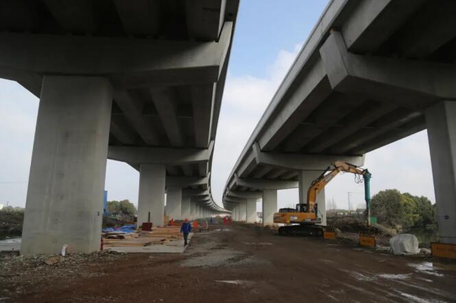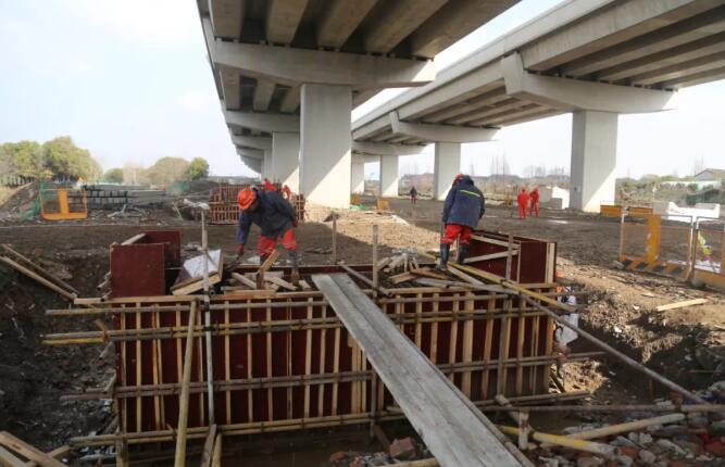 地面与高架桥的建设已经全部恢复,工人正在同步进行地面道路曹罗路的管线铺设以及老大理港、庙浜、严家塘、高家塘、潮塘等五座跨河桥梁的施工。