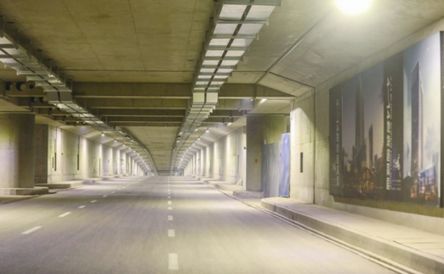据介绍,地下环路长度约4公里,环路主线2.1公里,共设置六个匝道口,主体为3车道,埋深约14米。地下环路工程2016年7月开始建设,目前主体工程已完工,剩余电气、通风、压力排水、装饰装修、弱电智能化、消防等后续工作正在按计划稳步推进中。