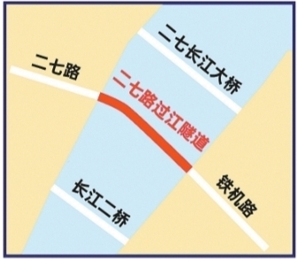 二七路过江通道位于武汉长江二桥和二七长江大桥之间,过江隧道采取单洞上下双层公路,盾构外径15.5米,这是国内在建直径最大的盾构隧道。