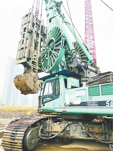 汉口沿江大道滨江苑3期附近,虽然天下着大雨,但是项目工地上仍照常作业,成槽机和铣槽机配合作业,正在开挖槽段,要在地下开挖一段深47.7米、厚1.5米的沟槽出来。后续再放入钢筋笼浇筑混凝土,形成一道地下的“防护墙”,为地下盾构作业提供安全支撑。