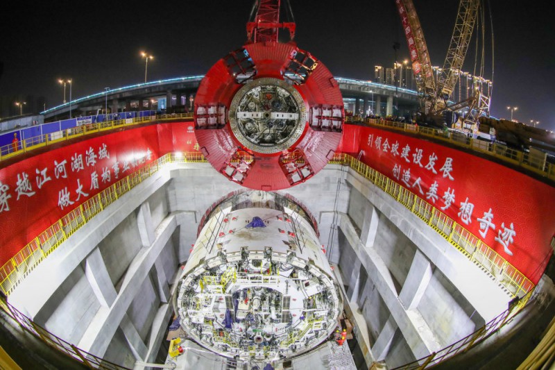 “永平号”盾构机由主机、刀盘、盾体、1个连接桥及4节台车等组成,整机长度160米、总重4200吨。刀盘为盾构机最大、最重单个部件,达500多吨。刀盘下井是盾构机组装过程中难度最高、危险系数最大的一项工序。两台分别为750吨、500吨的大型履带吊车合力,将刀盘从地面升起,并在互相协作下,使刀盘在半空中来了一个“90度翻身”缓慢直立起来。此时,500吨的吊车退出,由750吨的履带吊独力吊上刀盘,一点点调整方位,准确地吊下盾构机始发井,为盾构机装上“巨牙”。
