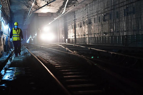 据介绍,地铁的轨道单根长度大约25米,运输到地下区间之后,安装到指定的轨道位置,最后一道工序是由工人进行现场焊接,达到“无缝”的视觉效果。图为工作人员正在检查轨道扣件、胶垫安装情况。记者在现场见到,轨道拼接处肉眼几乎看不到任何的“缝隙”,两根钢轨完全焊接到一起,实现了完美的“融合”。仅仅在灯光的照射下,拼接处有一点点的颜色不同,显示出这是一处拼接点。