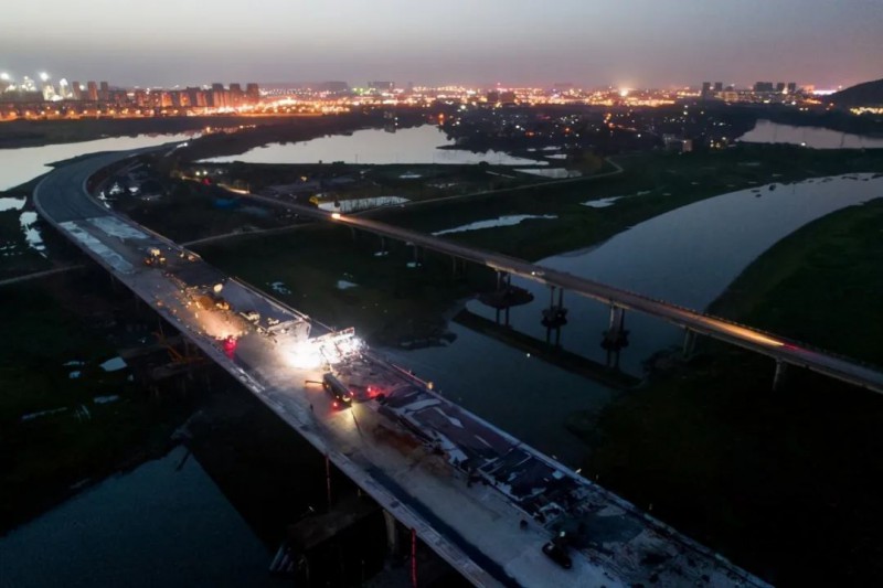晚8时许,记者在现场看到,檀军公路大桥是一座连续梁桥,中间的挂篮悬浇设备正在浇筑最后一车混凝土,为桥梁合龙做准备。