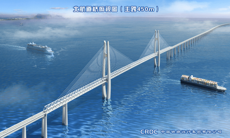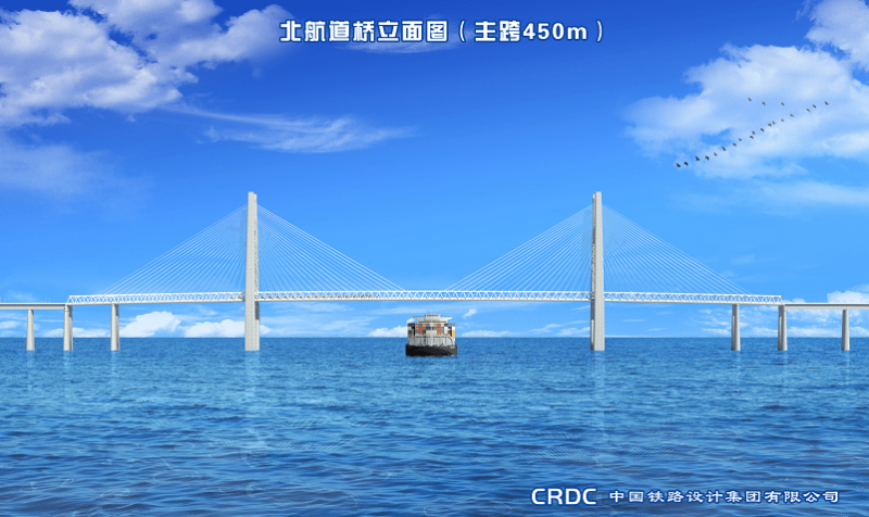 北航道桥主跨达450米,采用混凝土箱—钢桁组合梁斜拉桥并铺设无砟轨道,这是在世界高速铁路建设中的首次使用。海中引桥采用80米主跨的预应力混凝土连续梁,最大联长达3080米,其超长联、大跨度、曲线连续梁无缝线路创世界纪录。
