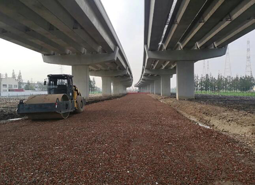 工程施工全过程秉持“低影响”施工理念,沿线施工便道及地面辅路路基填料均采用经破碎、筛分的建筑旧料,吸收利用了周边大量拆迁废料,避免了土方运输对周边社会交通的影响。