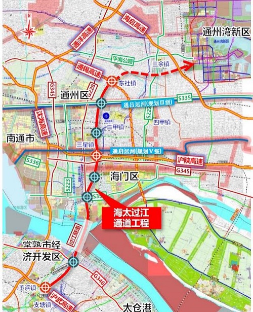 海太过江通道为公铁复合过江通道,是国家发改委近期重点推动实施的过江通道之一,其中公路部分为南通至常熟高速公路(S13)的重要组成部分,铁路部分为如通苏湖城际铁路过江设施。