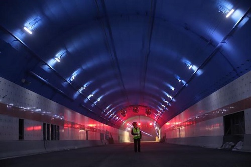 隧道于2021年1月23日实现双线贯通,目前北岸工区正在进行保通道路施工,双线隧道内铺垫层已全部完成,隧道内正在进行沥青铺设、防淹门、人防门施工;北岸隧道管理中心正在加快施工;南北岸装饰装修和机电安装工作同步进行;南岸工区附属结构洞内二次砌筑、风塔、后浇带等附属结构在加紧施工。