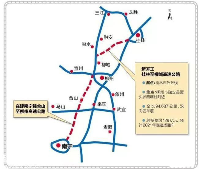 桂林至柳城高速公路,简称新桂柳高速,它既是《广西高速公路网规划修编》(2010-2020)规划中的“纵5”桂林经柳州至南宁高速公路第二通道的组成部分,也是“横2支线”桂林至河池高速公路的组成部分。桂林至柳城高速公路属于国家交通公路网项目,线路全长94.556公里,为双向四车道,设计速度100公里/小时,项目采用PPP模式投资并承建,总投资129亿元。建设工期为4年,于2017年10月29日正式开工。项目起于桂林市临桂区,经永福县、融安县等地,终点设在融安县潭头乡,接入三江至柳州高速公路。