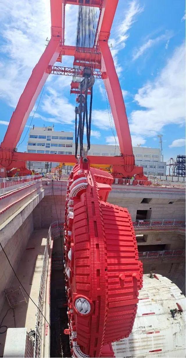 妈湾跨海通道即将进入隧道掘进阶段。5月11日下午14:00,应用于国内最大直径水下盾构隧道的“妈湾号”盾构机刀盘顺利吊装至始发井底,至此,“妈湾号”盾构机所有主要部件全部吊装下井。