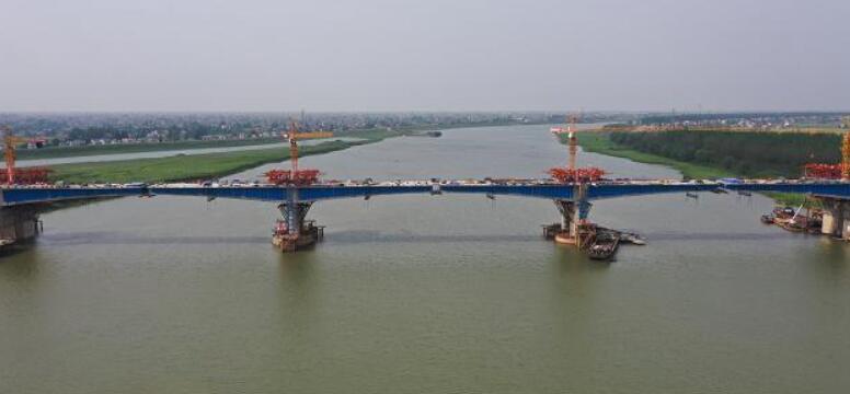 南阳湘江特大桥位于湘阴县鹤龙湖镇南阳村,全长7120.6米。其中主桥长511.88米,主跨120米,为目前国内最大跨径波形钢腹板悬拼梁桥。大桥主桥上部结构为装配式波形钢腹板变截面PC组合梁,相比常规箱梁结构,采用波形钢腹板替代混凝土腹板,自重减轻25%至30%,且能完全避免混凝土腹板开裂现象。此外,装配式悬拼施工精度高、速度快,施工质量更可控、效率明显提升。通过运用此工艺,南阳湘江特大桥创造了最快2.5天/片的悬拼施工新纪录。