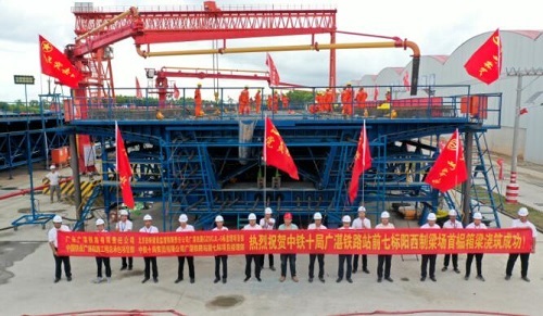 为全面落实“样板先行、精品引路、开工必优”的标准化建设管理要求,扎实做好全线首榀箱梁的预制工作,中国铁设广湛铁路总承包项目部领导高度重视,工程部、安质部多次到现场调研、交流。从梁场规划到建设方案,从制梁方案到工艺流程,进行严格把控,细化到每个工序、每个工装,选择最优措施,同时严格各项工序检查验收。面对工期紧、征地拆迁困难、技术标准高、施工技术难点多等多项严峻挑战,建设者们以“高标定位,全面创优,精心打造标准化梁场”为宗旨,精心筹划,不等不靠,加速推进大临建设,为按时开始梁片预制打下了坚实基础。首榀箱梁的成功浇筑,为广湛铁路工程建设擂响了战鼓,为2021年工作的全面推进再次吹响了冲锋号角。在后续的建设过程中,广湛铁路建设者将锁定安全、优质、高效的管理目标,落实各项管理措施,全力推进项目建设,加快桥梁工程施工进度,努力完成本年度各项目标任务。