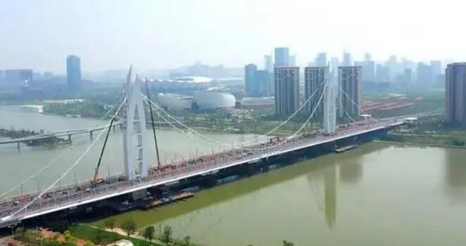 据了解,大桥全长2.3公里,主桥采用主跨为300米的空间双索面自锚式悬索桥,是目前国内最大跨空间索面自锚式悬索桥、世界最大跨空间主缆双塔自锚式悬索桥,也是世界最宽整体桥面空间索面自锚式悬索桥。桥面宽56米,桥塔全高129.5米,全部为钢结构,总用钢量4.2万吨,相当于6座埃菲尔铁塔的用钢量。