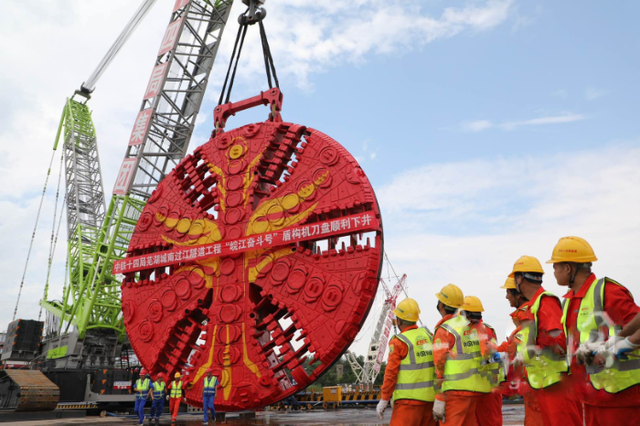 中铁十四局集团的建设者们迎酷暑、战高温,无惧“烤”验,克服汛期强降雨影响,奋战 60个日夜,顺利快速完成了刀盘焊接组装。他们精心策划,认真组织,缜密审查,在2台1250吨和400吨大型履带吊车的共同配合下,历经2个小时,实现刀盘顺利下井,为“皖江奋斗号”盾构机组装重大节点画上完美句号。“皖江奋斗号”盾构机刀盘的顺利吊装,为下一步盾构机始发奠定了坚实基础。