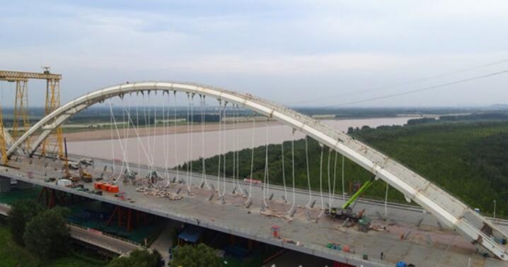 据悉,南跨56根吊索将于月底安装到位,8月10日,整座桥梁200根吊索全部张拉完成。齐鲁黄河大桥为下承式网状系杆拱桥,按照双向八车道设计,线路全长6742米,主桥长度1170米,主跨径达420米、宽60.7米,创造了世界上同类型桥梁最大跨径、最大梁宽、最高预应力拉索的纪录。